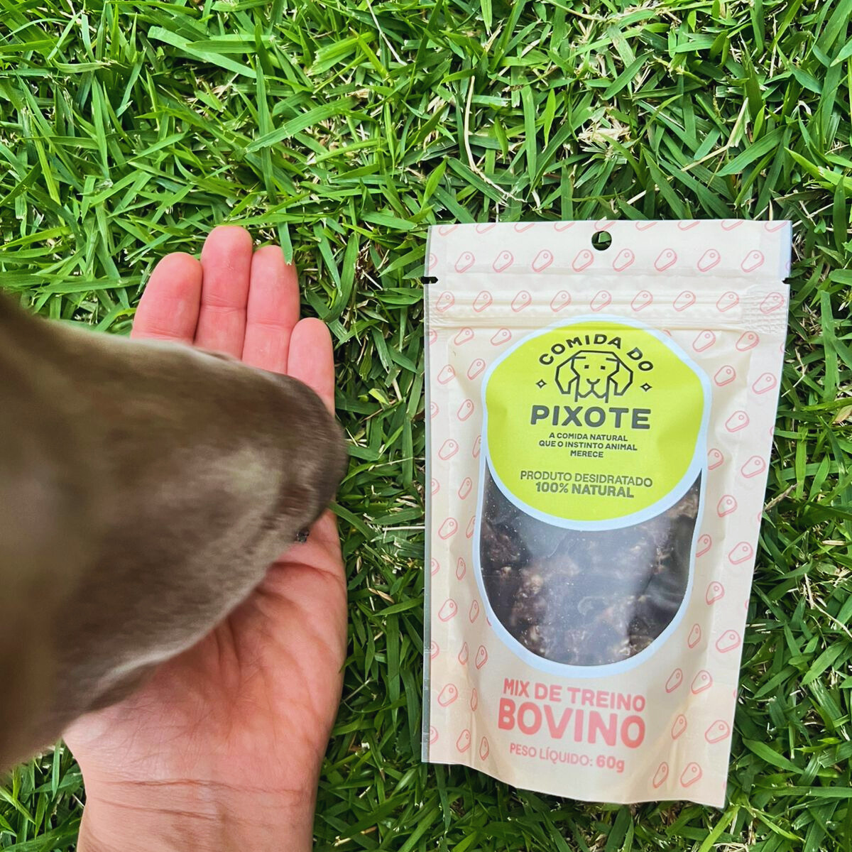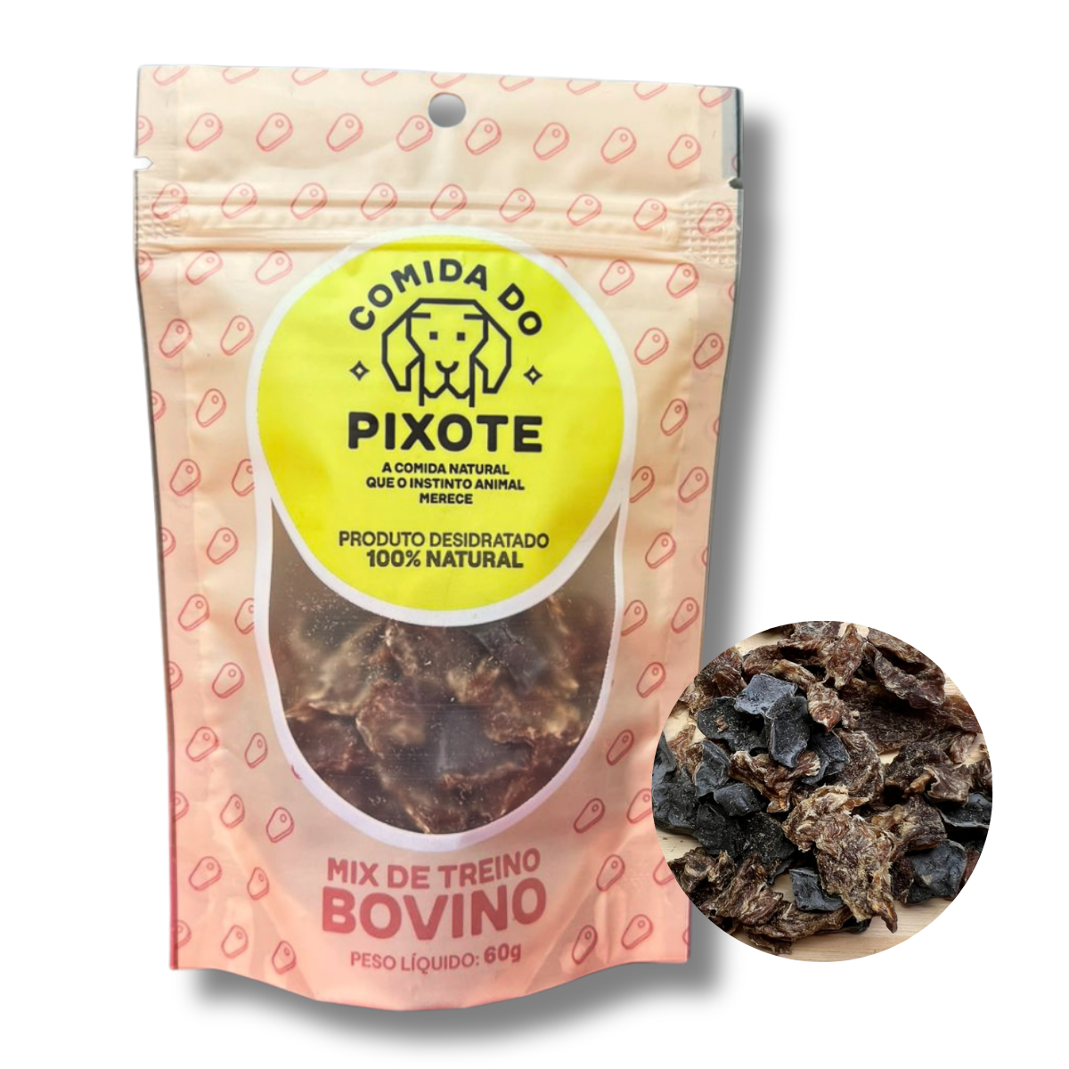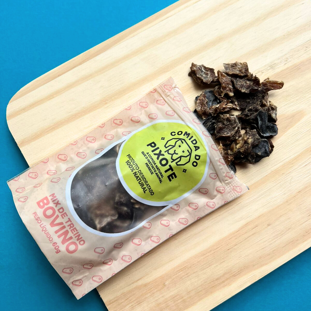 A linha Mix de Treino nasceu com a função de facilitar e tornar a hora do adestramento mais saborosa e nutritiva. O Mix de Treino Bovino é feito com pedacinhos pequenos de fígado e músculo bovinos, desidratados lentamente, sob temperatura controlada.